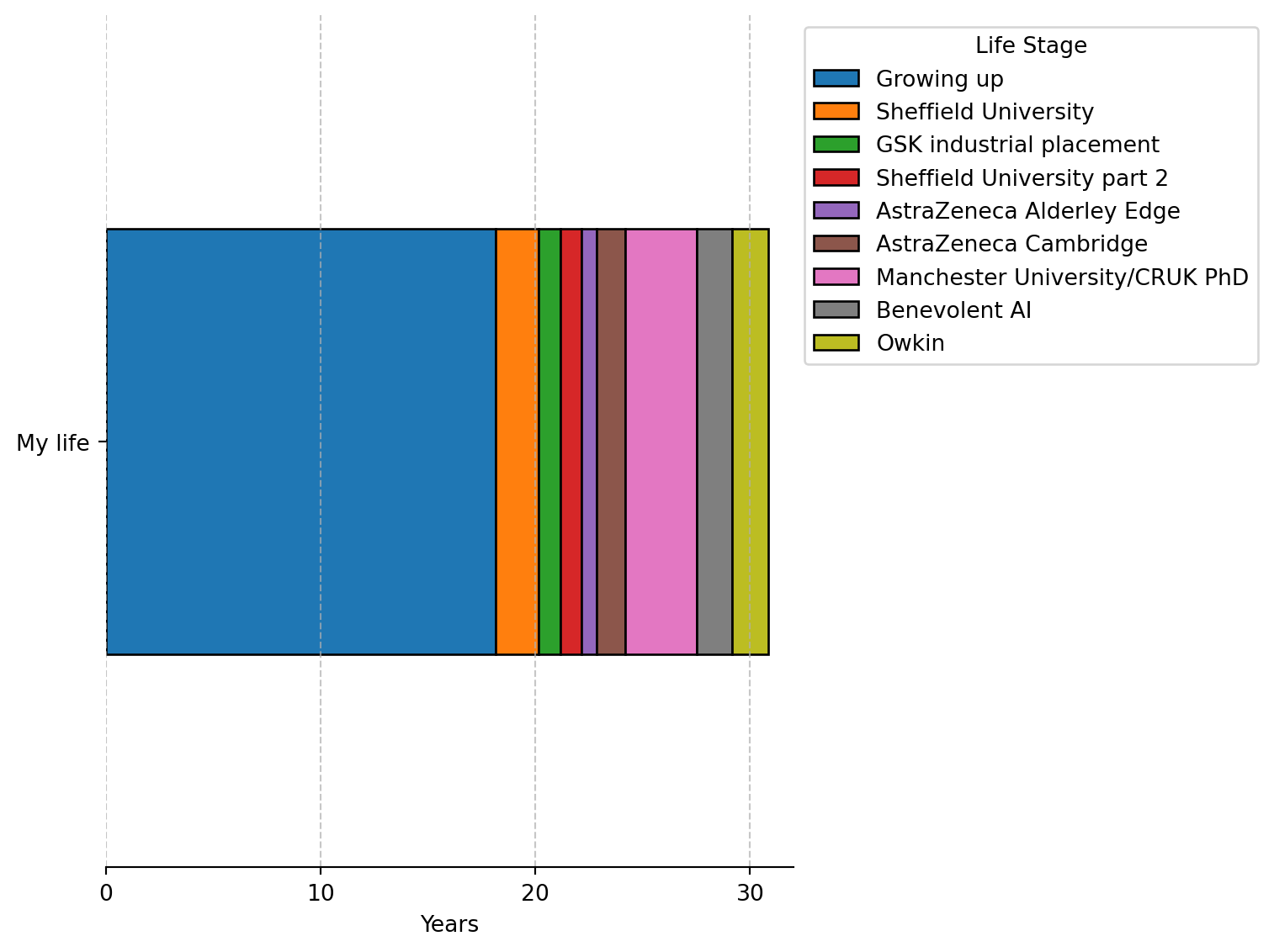 import seaborn as snsimport matplotlib.pyplot as pltimport pandas as pd# create datalife = pd.DataFrame({'life_stage': ["Growing up", "Sheffield University", "GSK industrial placement", "Sheffield University part 2", "AstraZeneca Alderley Edge", "AstraZeneca Cambridge", "Manchester University/CRUK PhD", "Benevolent AI", "Owkin"],'role': ["Messing around", "Biomedical science", "In vitro immunology", "Biomedical science", "Animal technician", "In vitro oncology & early clinical development", "Computational biologist & bioinformatician in cancer immunology", "Data science", "Data science" ],'months': [(18*12)+2, 2*12, 1*12,1*12, 8, 2*8, (3*12)+4, 20, 20],'me': ['My life']*9})life.loc[:, 'years'] = life['months'] /12life['life_stage'] = pd.Categorical(life['life_stage'], categories=["Growing up", "Sheffield University", "GSK industrial placement", "Sheffield University part 2", "AstraZeneca Alderley Edge", "AstraZeneca Cambridge", "Manchester University/CRUK PhD", "Benevolent AI", "Owkin"], ordered=True)# Create the plotimport pandas as pdimport matplotlib.pyplot as plt# Sample Data (Replace this with your actual DataFrame)# Assuming 'life' already exists and has columns 'months', 'me', and 'life_stage'life['years'] = life['months'] /12# Convert months to years# Pivot data for stackinglife_pivot = life.pivot_table(index='me', columns='life_stage', values='years', aggfunc='sum')# Plot stacked bar chartfig, ax = plt.subplots(figsize=(8, 6))life_pivot.plot(kind='barh', stacked=True, ax=ax, edgecolor='black')# Customizing the plot to match ggplot2ax.set_xlabel('Years')ax.set_ylabel('')ax.set_xlim(0, 32)ax.set_xticks([0, 10, 20, 30])ax.invert_yaxis() # Flip to match coord_flip()# Remove spines for minimal themeax.spines['top'].set_visible(False)ax.spines['right'].set_visible(False)ax.spines['left'].set_visible(False)# Add legend and gridax.legend(title='Life Stage', bbox_to_anchor=(1, 1))ax.grid(axis='x', linestyle='--', alpha=0.7)plt.tight_layout()plt.show()